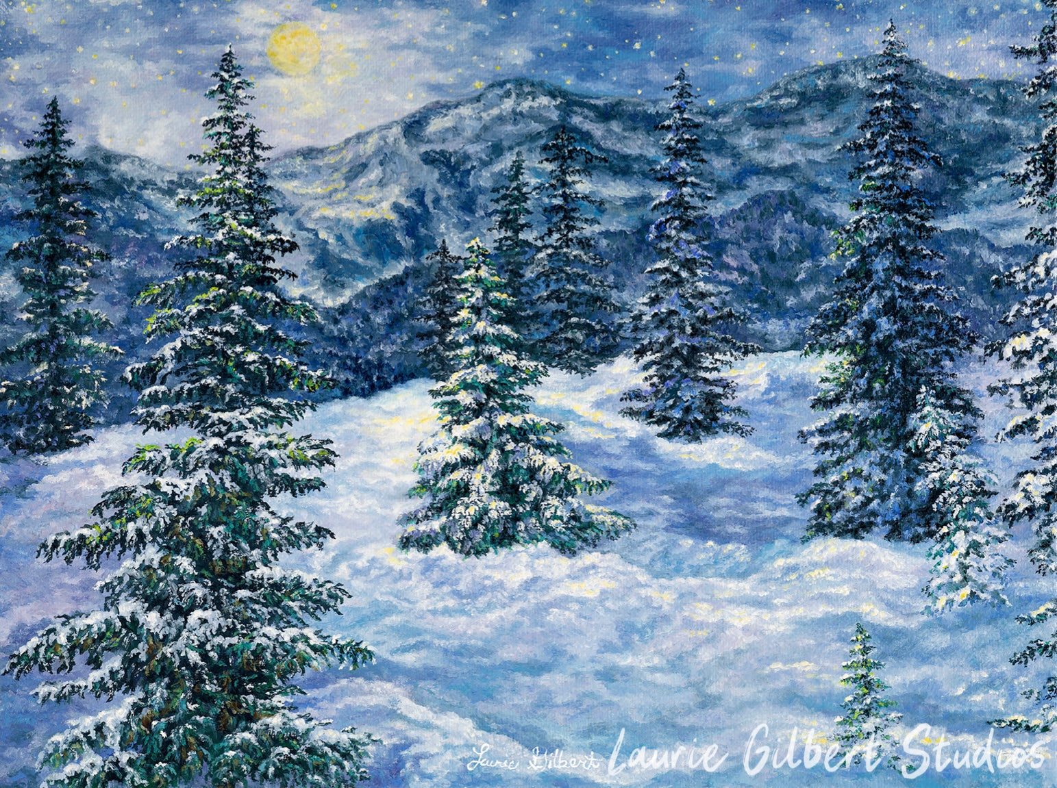 A snowy forest glows under a sky full of twinkling stars and a sleepy yellow moon. Each tree stands like a frosted dream, quietly watching the night sparkle all around.