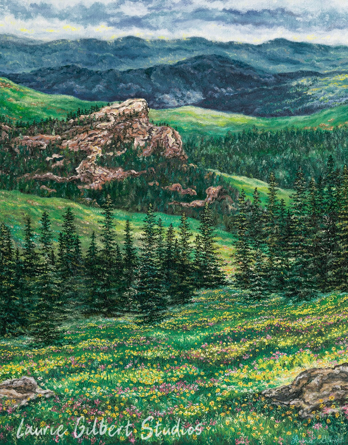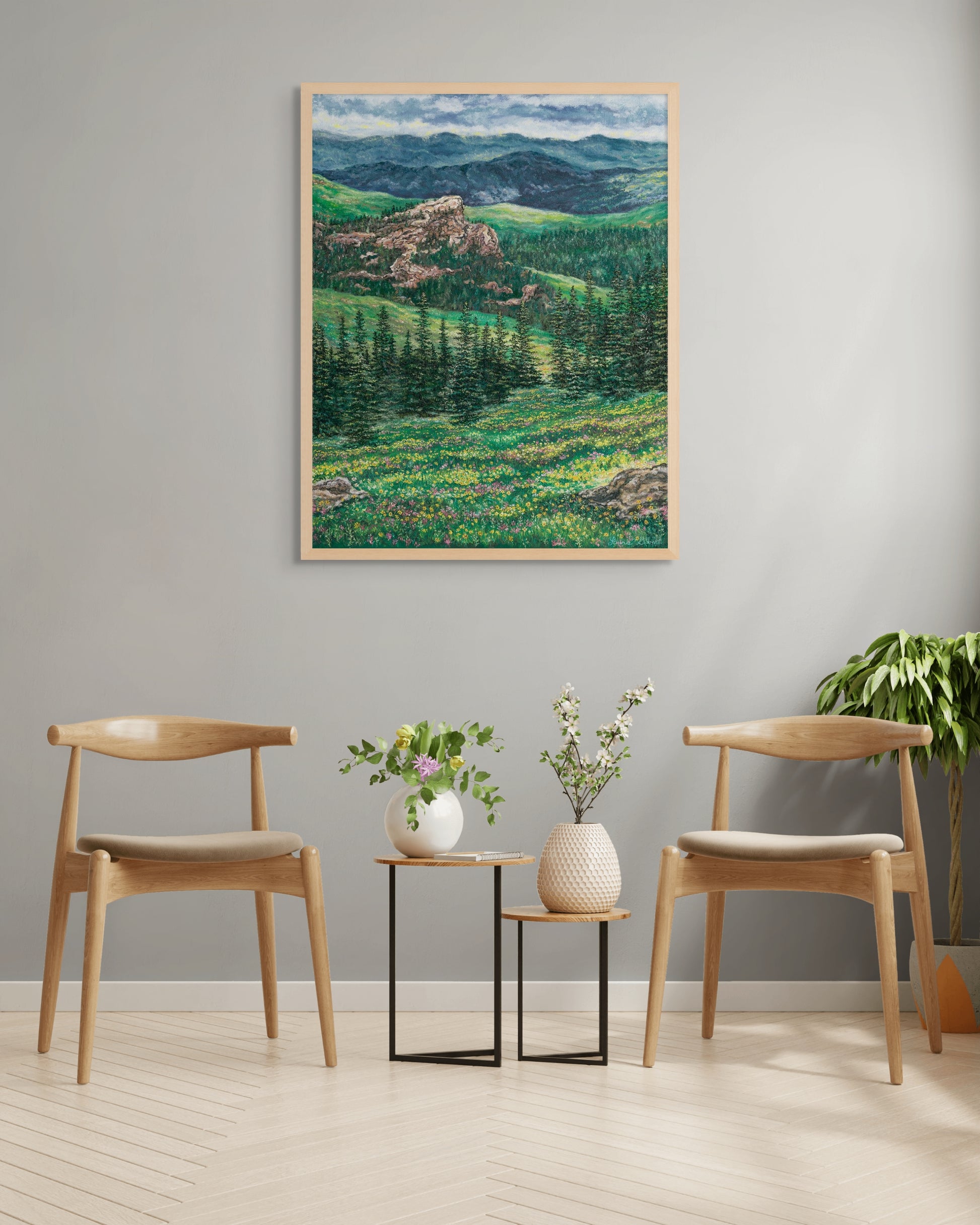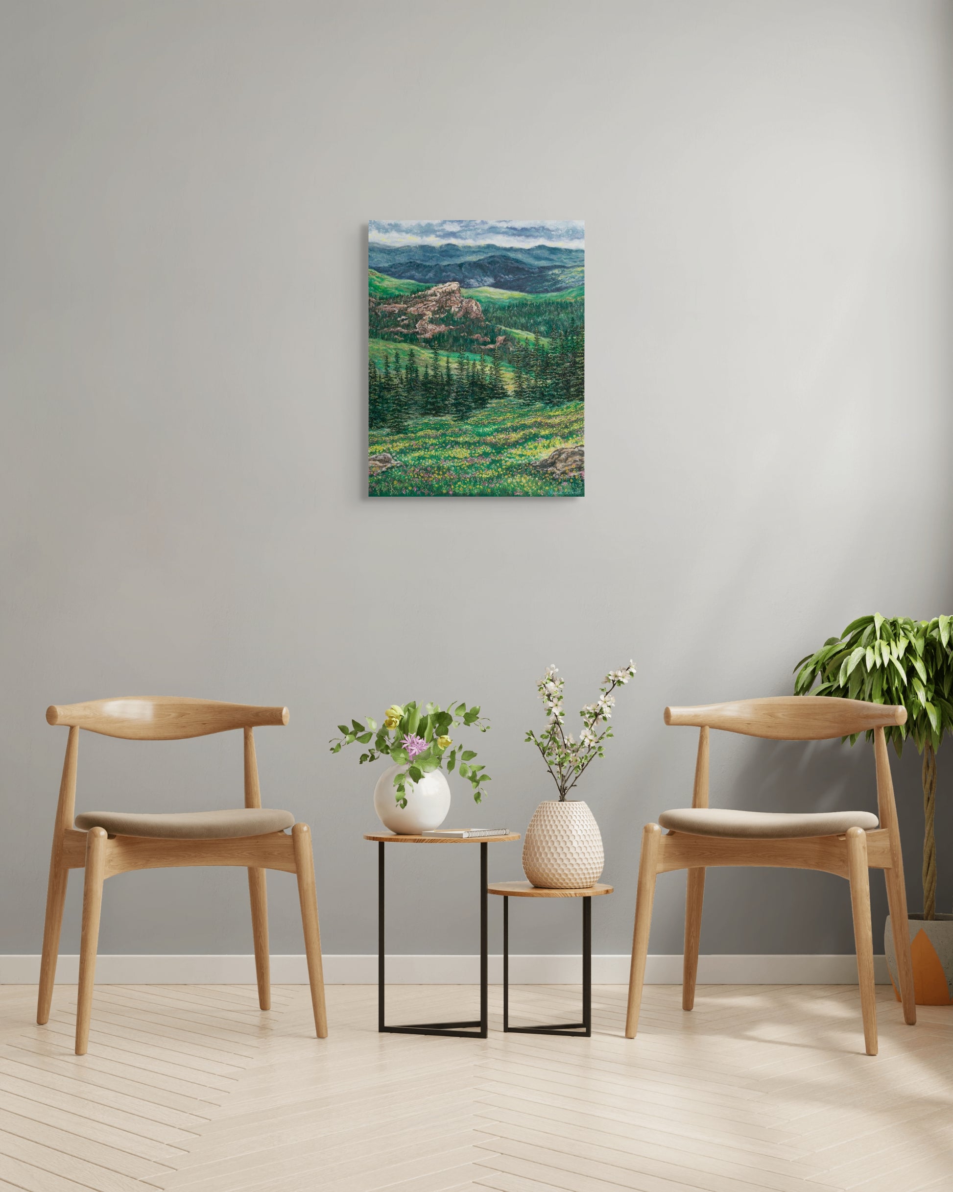 Bright wildflowers scatter across a sunlit meadow, leading the eye toward a sunlit path up the mountain to a view of a breathtaking valley. Velvety blue mountains rise in the distance, layered beneath a sky alive with drifting clouds.