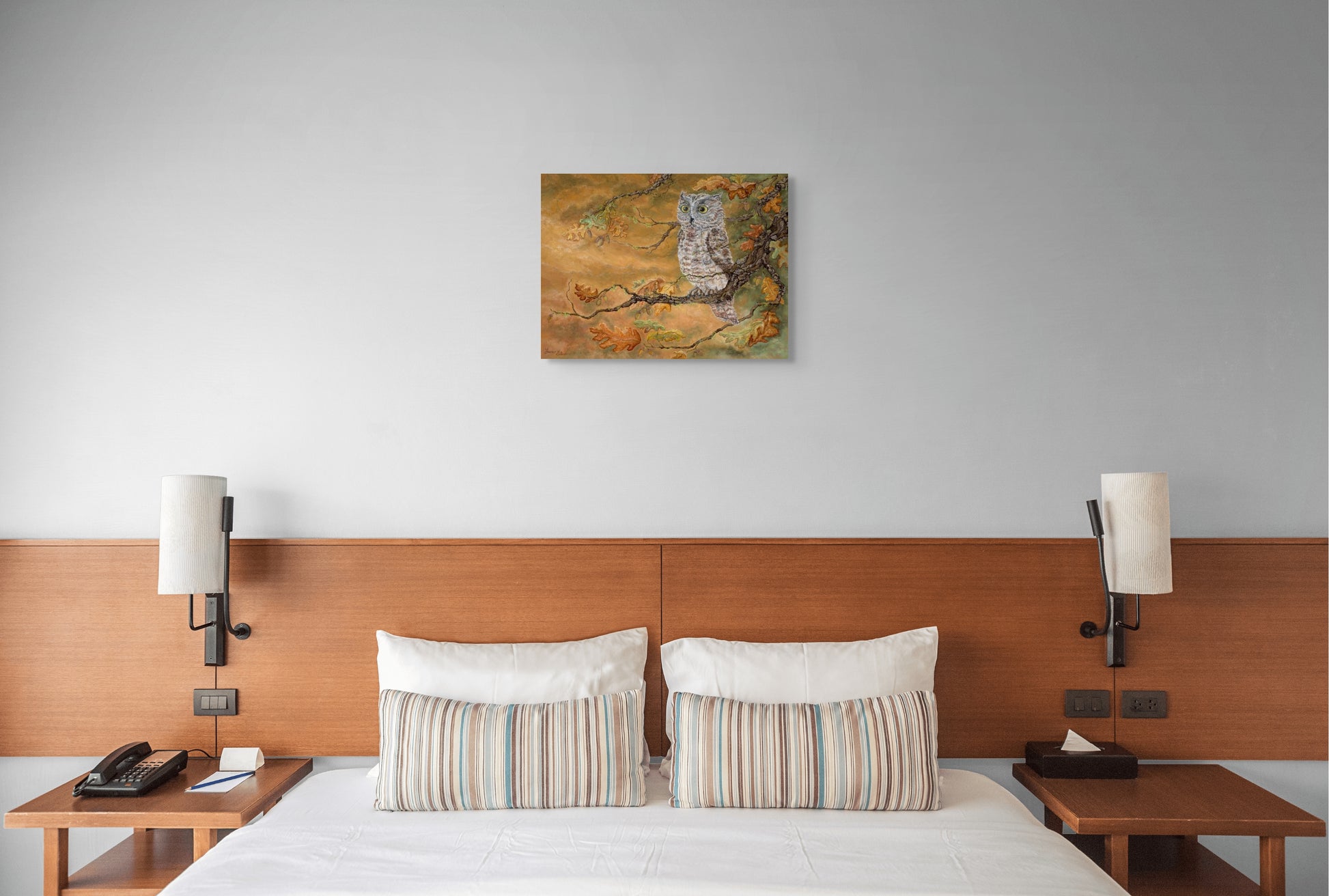 Perched among autumn leaves, the perky owl watches the world with a golden sky behind him glowing.